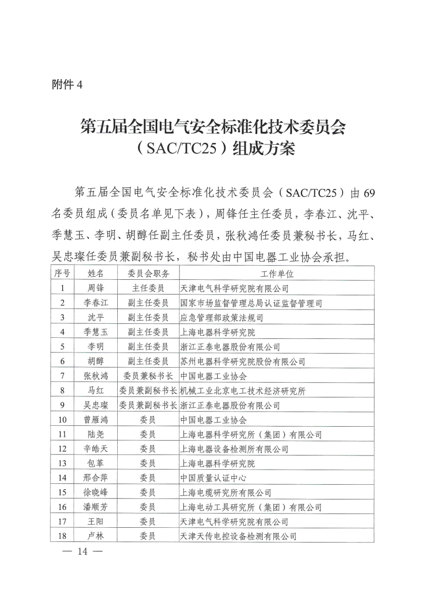 第五屆全國(guó)電氣安全標(biāo)準(zhǔn)化技術(shù)委員會(huì)(SAC/TC25)任期5年,由69名委員組成,秘書(shū)處由中國(guó)電器工業(yè)協(xié)會(huì)承擔(dān)。