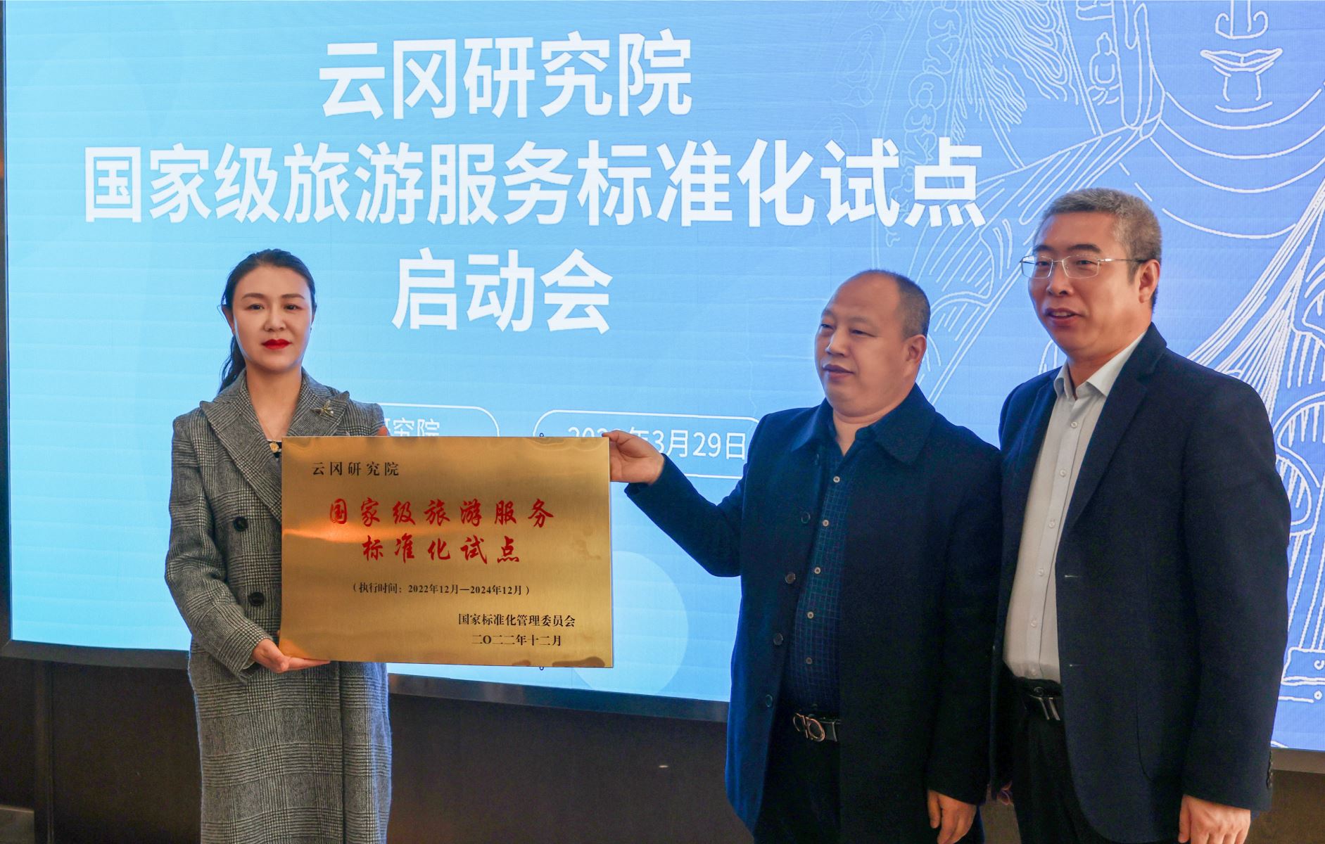 最后,安建貴、常煒共同為云岡研究院國(guó)家級(jí)旅游服務(wù)標(biāo)準(zhǔn)化試點(diǎn)授牌。