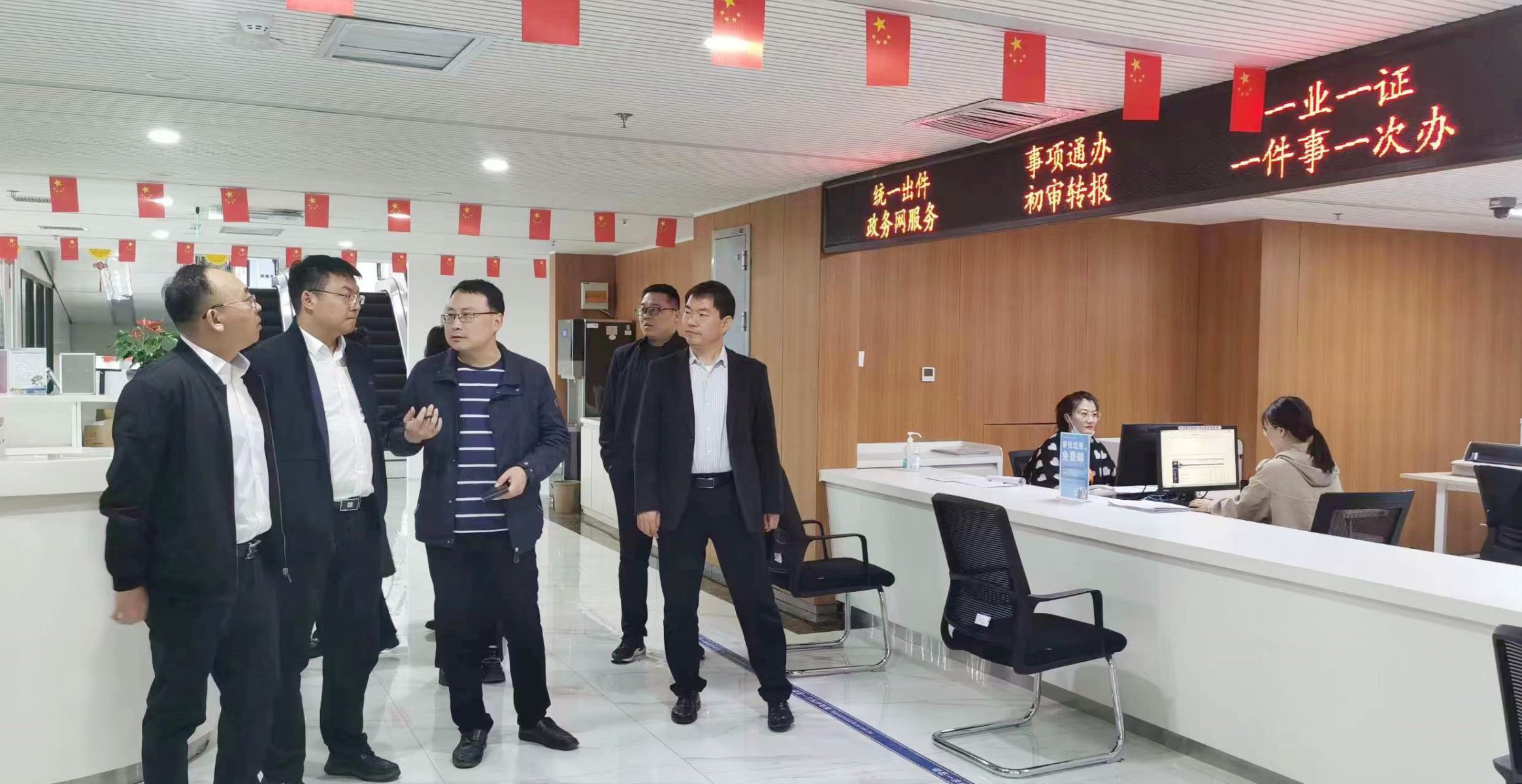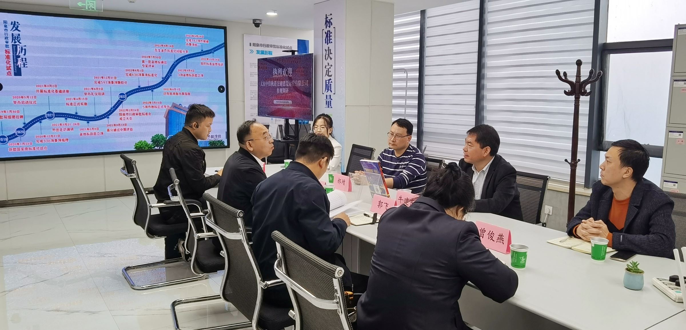 2023年4月27日,太原中鐵軌道交通建設(shè)運(yùn)營有限公司企業(yè)管理部部長郭飛、生產(chǎn)技術(shù)部副部長嚴(yán)京晶一行蒞臨陽泉市行政審批服務(wù)管理局標(biāo)準(zhǔn)化辦公室進(jìn)行工作調(diào)研。陽泉市行政審批服務(wù)管理局黨組成員、副局長牛建東,政務(wù)管理科科長郝增陪同調(diào)研。