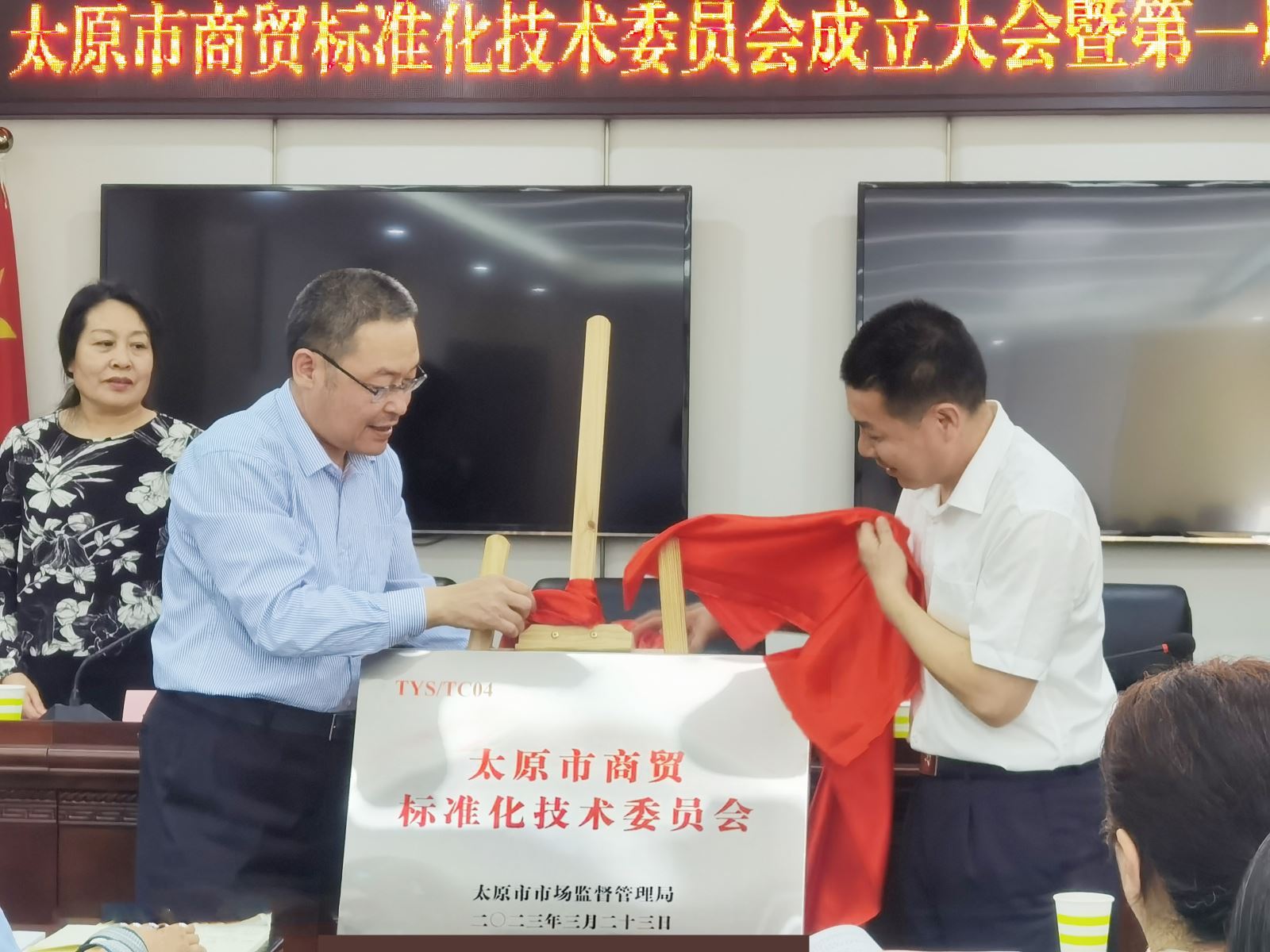 會上,夏文武介紹參會人員及商貿標委會籌建情況,褚鮮萍宣讀了《關于成立太原市商貿標準化技術委員會的批復》。夏文武和趙勇共同為太原市商貿標準化技術委員會進行了揭牌;與會領導為委員代表頒發(fā)了聘書。