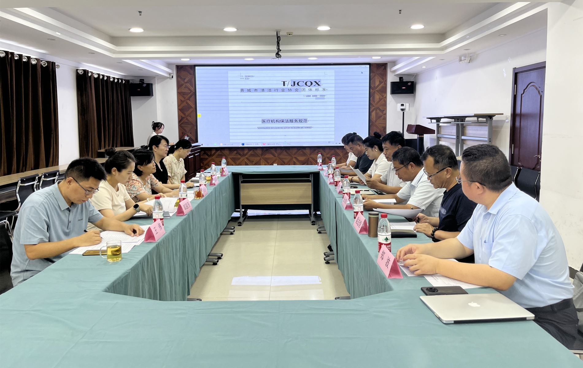 2024年8月16日,晉城市清潔行業(yè)協(xié)會組織召開《醫(yī)療機構(gòu)保潔服務(wù)規(guī)范》團體標準專家審查會。來自晉城市市場監(jiān)督管理局、晉城市商務(wù)局、晉城市衛(wèi)生和健康委員會、晉城市綜合檢驗檢測中心、晉城市人民醫(yī)院的五位專家組成標準審查專家組,晉城市潔霸清潔服務(wù)股份有限公司董事長程晉軍、副總經(jīng)理張永智、工會主席兼辦公室主任張海霞、總顧問梁志恒,晉城市清潔行業(yè)協(xié)會秘書長郭斗旺出席會議。會議由麥斯達夫標準化首席執(zhí)行官鄭波主持。