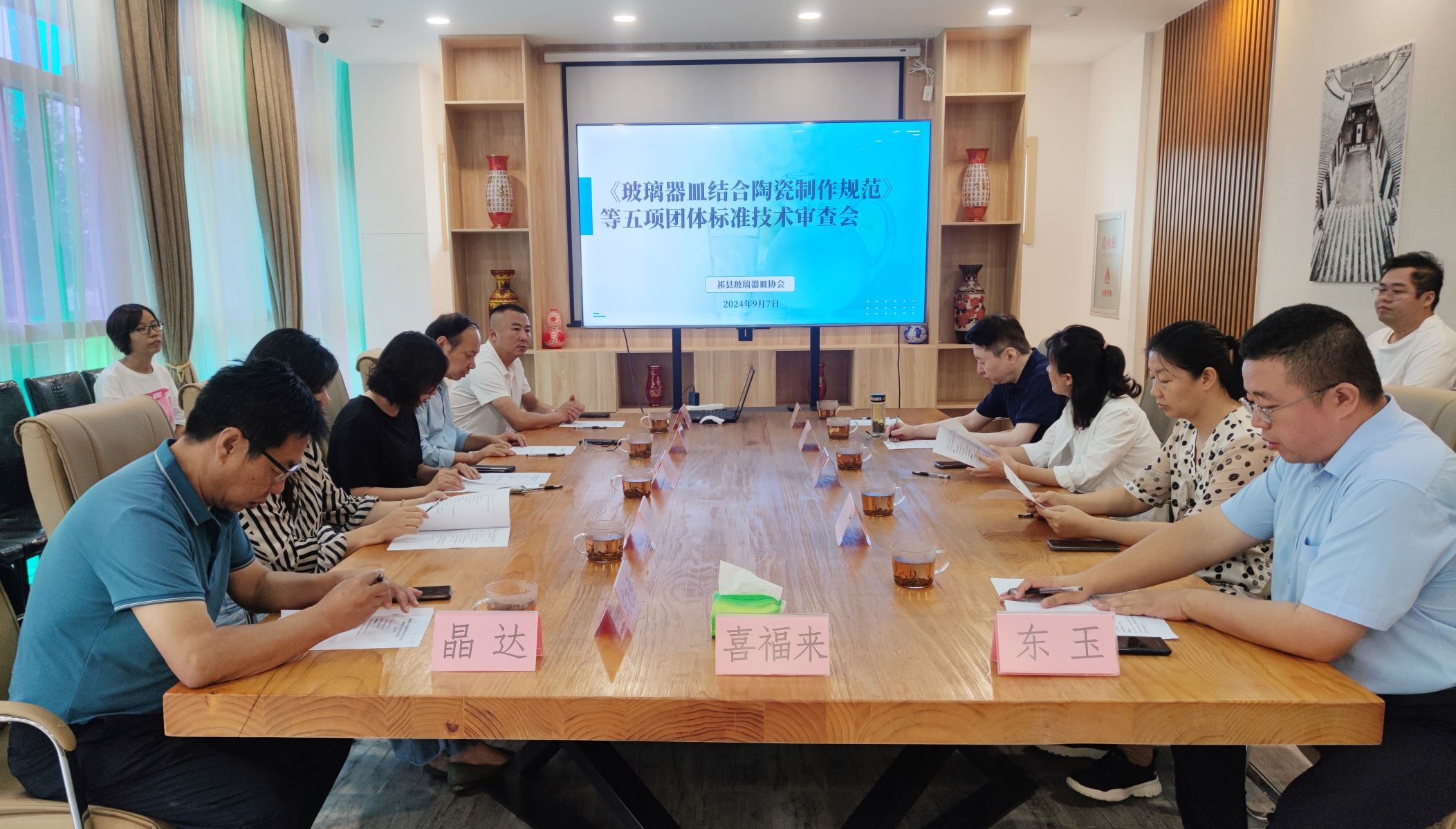 2024年9月7日,《玻璃器皿結合陶瓷制作規(guī)范》等五項祁縣玻璃器皿協會標準專家審查會以線下線上相結合的形式在晉中市祁縣一帶一路合作區(qū)規(guī)劃展示館召開。來自中國輕工業(yè)聯合會、山西省市場監(jiān)督管理局、晉中市市場監(jiān)督管理局、華東理工大學、中北大學、太原工業(yè)學院、山西省玻璃陶瓷研究所的九名專家組成標準審查專家組。祁縣玻璃器皿特色專業(yè)鎮(zhèn)建設標準化試點領導小組楊子青、鄭波、張世躍、張莎出席會議。會議由鄭波主持。