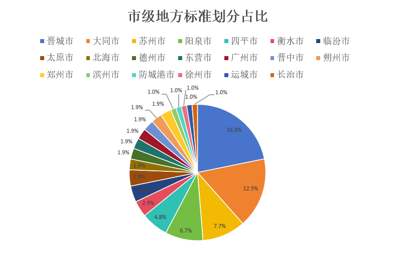 從省級行政區(qū)域來看,廣東、江蘇、山東、河南、河北、山西、廣西、吉林、海南等八個(gè)?。ㄗ灾螀^(qū))均有涉及。從市級行政區(qū)域來看,晉城市地方標(biāo)準(zhǔn)17項(xiàng),占比16.3%;大同市地方標(biāo)準(zhǔn)13項(xiàng),占比12.5%;蘇州市地方標(biāo)準(zhǔn)8項(xiàng),占比7.7%;陽泉市地方標(biāo)準(zhǔn)7項(xiàng),占比6.7%;四平市地方標(biāo)準(zhǔn)5項(xiàng),占比4.8%。此外,衡水、太原、臨汾各3項(xiàng),廣州、鄭州、北海、德州、東營、晉中、朔州各2項(xiàng);徐州、濱州、防城港、長治、運(yùn)城各1項(xiàng)。