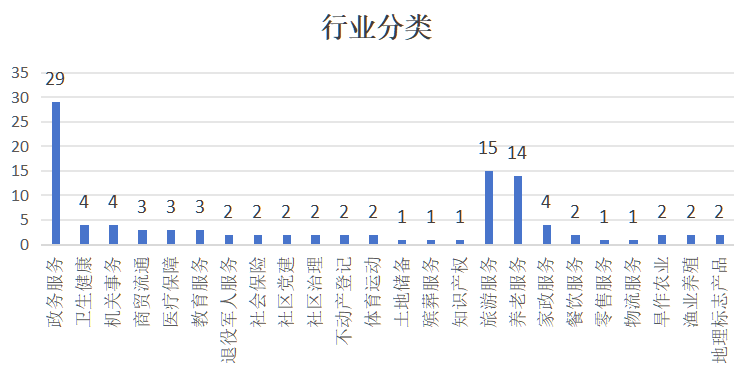 按照行業(yè)領(lǐng)域劃分,社會事業(yè)領(lǐng)域的地方標(biāo)準(zhǔn)61項(xiàng),占比58.7%;服務(wù)業(yè)領(lǐng)域的地方標(biāo)準(zhǔn)37項(xiàng),占比35.6%;農(nóng)業(yè)領(lǐng)域的地方標(biāo)準(zhǔn)6項(xiàng),占比5.8%。從行業(yè)分類來看,政務(wù)服務(wù)29項(xiàng)、衛(wèi)生健康4項(xiàng)、機(jī)關(guān)事務(wù)4項(xiàng)、商貿(mào)流通3項(xiàng)、醫(yī)療保障3項(xiàng)、教育服務(wù)3項(xiàng)、退役軍人服務(wù)2項(xiàng)、社會保險(xiǎn)2項(xiàng)、社區(qū)黨建2項(xiàng)、社區(qū)治理2項(xiàng)、不動產(chǎn)登記2項(xiàng)、體育運(yùn)動2項(xiàng)、土地儲備1項(xiàng)、殯葬服務(wù)1項(xiàng)、知識產(chǎn)權(quán)1項(xiàng);旅游服務(wù)15項(xiàng)、養(yǎng)老服務(wù)14項(xiàng)、家政服務(wù)4項(xiàng)、餐飲服務(wù)2項(xiàng),零售服務(wù)、物流服務(wù)各1項(xiàng);旱作農(nóng)業(yè)2項(xiàng)、漁業(yè)養(yǎng)殖2項(xiàng)、地理標(biāo)志產(chǎn)品2項(xiàng)。