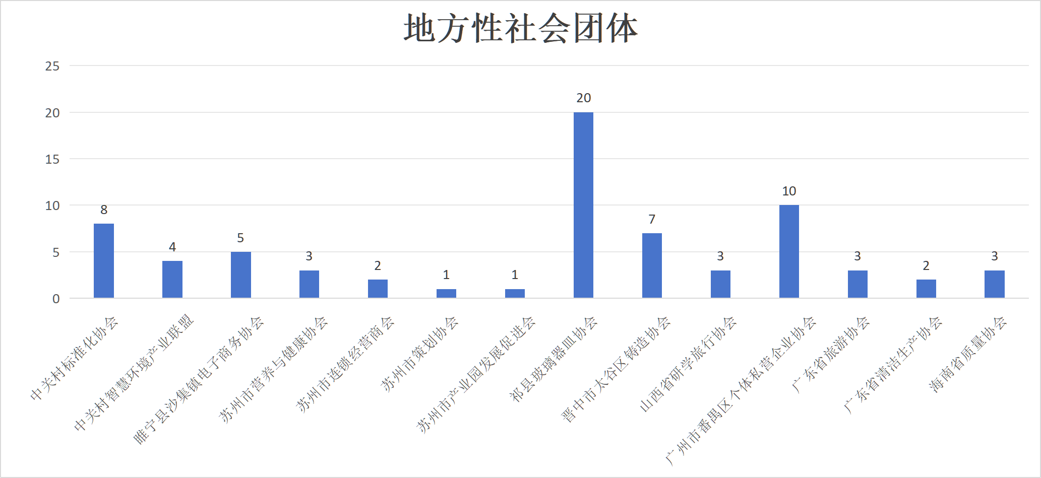 與12家地方性社會團體合作,共計研制72項團體標準。其中,在北京市的2家社會團體研制12項團體標準,在江蘇省的5家社會團體研制12項團體標準,在山西省的3家社會團體研制30項團體標準,在廣東省的3家社會團體研制15項團體標準,在海南省的1家社會團體研制3項團體標準。