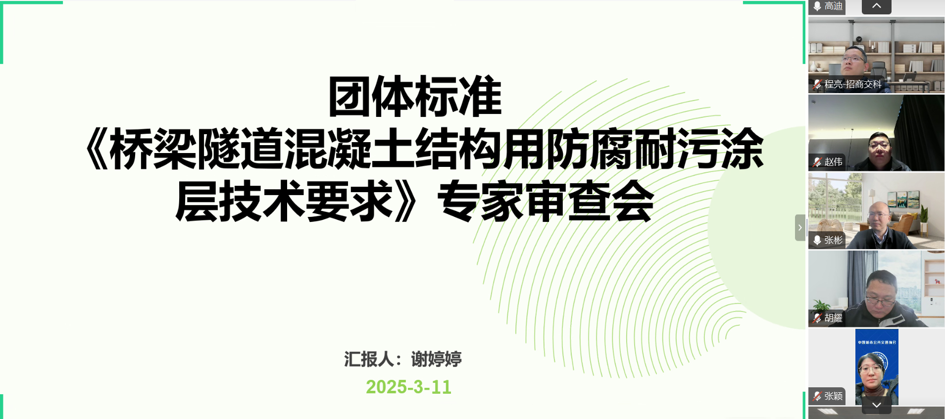 2025年3月11日,中國(guó)城市公共交通協(xié)會(huì)以線上會(huì)議形式組織召開(kāi)團(tuán)體標(biāo)準(zhǔn)《橋梁隧道混凝土結(jié)構(gòu)用防腐耐污涂層技術(shù)要求》專(zhuān)家審查會(huì)。中國(guó)地質(zhì)大學(xué)(北京)、招商局重慶交通科研設(shè)計(jì)院有限公司、中國(guó)工程建設(shè)標(biāo)準(zhǔn)化協(xié)會(huì)、中鐵隧道集團(tuán)二處有限公司、中國(guó)城市公共交通協(xié)會(huì)的五名專(zhuān)家組成標(biāo)準(zhǔn)審查專(zhuān)家組。標(biāo)準(zhǔn)主編單位中宜硅材(蘇州)納米新材料科技有限公司總經(jīng)理陳海龍、技術(shù)經(jīng)理胡耀以及參編單位代表參加會(huì)議。會(huì)議由麥斯達(dá)夫標(biāo)準(zhǔn)化市場(chǎng)總監(jiān)、蘇州公司總經(jīng)理王釗柱主持。