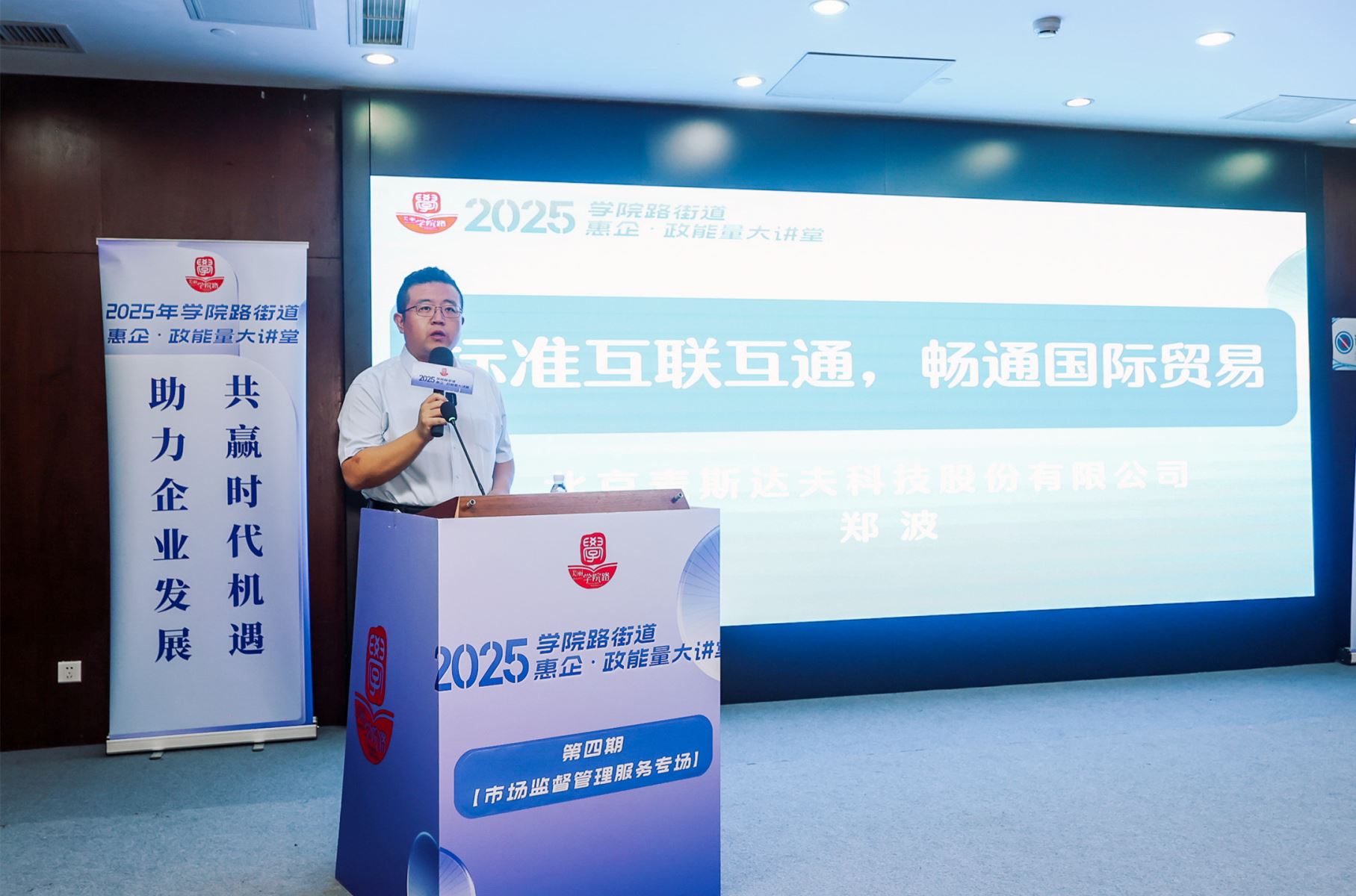 2025年9月18日,海淀區(qū)學(xué)院路街道“惠企·政能量大講堂”第四期活動(dòng)——市場(chǎng)監(jiān)督管理服務(wù)專場(chǎng)在天工大廈舉辦。本次活動(dòng)由海淀區(qū)市場(chǎng)監(jiān)督管理局指導(dǎo),學(xué)院路街道黨工委、辦事處主辦,學(xué)院路街道市場(chǎng)監(jiān)督管理所、海淀區(qū)市場(chǎng)監(jiān)督管理局創(chuàng)新合伙人八家產(chǎn)業(yè)集群服務(wù)站協(xié)辦。麥斯達(dá)夫集團(tuán)創(chuàng)始人、首席執(zhí)行官鄭波應(yīng)邀出席,并作題為《標(biāo)準(zhǔn)互聯(lián)互通 暢通國(guó)際貿(mào)易》的主旨報(bào)告。