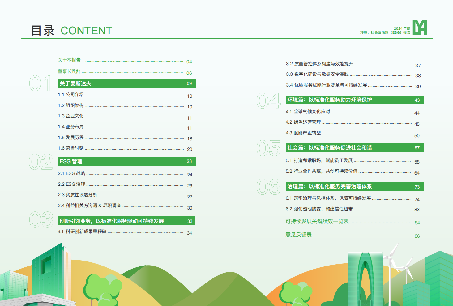 報告以可持續(xù)發(fā)展理念為核心,全面闡釋了麥斯達(dá)夫集團(tuán)如何將ESG要素深度融入企業(yè)戰(zhàn)略和日常運(yùn)營。在環(huán)境責(zé)任方面,集團(tuán)積極響應(yīng)國家“雙碳”目標(biāo),持續(xù)推進(jìn)節(jié)能降碳舉措,提升綠色運(yùn)營能力,不斷夯實低碳發(fā)展路徑。在社會責(zé)任領(lǐng)域,集團(tuán)不僅關(guān)注員工權(quán)益保障和職業(yè)成長,構(gòu)建和諧勞動關(guān)系,還致力于推動供應(yīng)鏈可持續(xù)管理,打造協(xié)同發(fā)展的“標(biāo)準(zhǔn)化生態(tài)圈”,助力行業(yè)整體責(zé)任水平提升。在治理層面,集團(tuán)持續(xù)優(yōu)化現(xiàn)代企業(yè)治理架構(gòu),完善ESG組織體系和管理機(jī)制,將ESG理念全面納入戰(zhàn)略規(guī)劃、決策流程和績效評估,為企業(yè)可持續(xù)發(fā)展提供了堅實的制度保障。