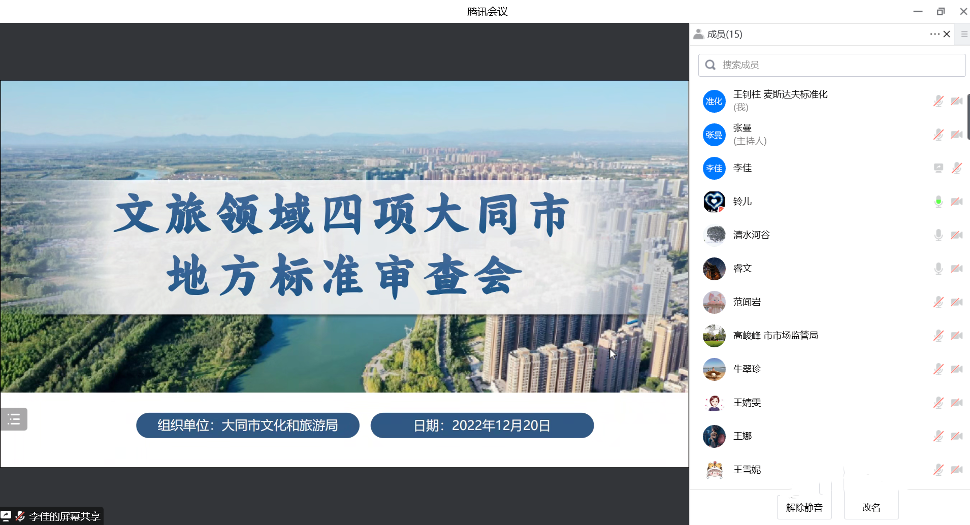 2022年12月20日,大同市文化和旅游局以線上形式組織召開(kāi)《云旅游服務(wù)規(guī)范》《大同古城標(biāo)識(shí)導(dǎo)向系統(tǒng)建設(shè)規(guī)范》《圖書(shū)館志愿服務(wù)規(guī)范》《旅游場(chǎng)所現(xiàn)場(chǎng)糾紛處理規(guī)范》四項(xiàng)大同市地方標(biāo)準(zhǔn)審查會(huì)。評(píng)審專家組由大同市文化和旅游標(biāo)準(zhǔn)化技術(shù)委員會(huì)、大同文化旅游投資集團(tuán)有限公司、大同市美術(shù)館、大同市市場(chǎng)監(jiān)督管理局、中科院地理科學(xué)與資源研究所等單位的五位專家組成。大同市文化和旅游局四級(jí)調(diào)研員常煒出席會(huì)議。大同市文化和旅游局、云岡研究院、大同市圖書(shū)館(大同市少兒圖書(shū)館)、山西大同大學(xué)云岡學(xué)學(xué)院、大同市文化藝術(shù)學(xué)校等標(biāo)準(zhǔn)起草組成員單位派員參加會(huì)議。