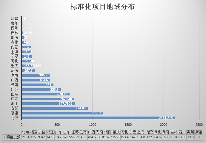 總體來看,北京和東部沿海省份由于經(jīng)濟(jì)比較發(fā)達(dá),接受新事物、新理念的能力更強,標(biāo)準(zhǔn)化項目層出不窮,單個項目的金額相對較大,而中西部等欠發(fā)達(dá)地區(qū)的標(biāo)準(zhǔn)化項目相對較少,金額也偏小。
