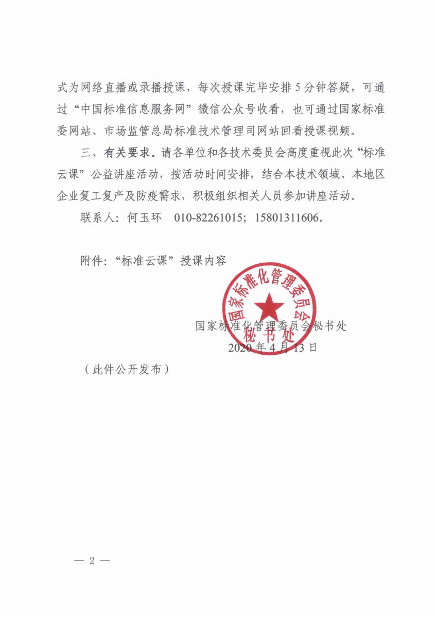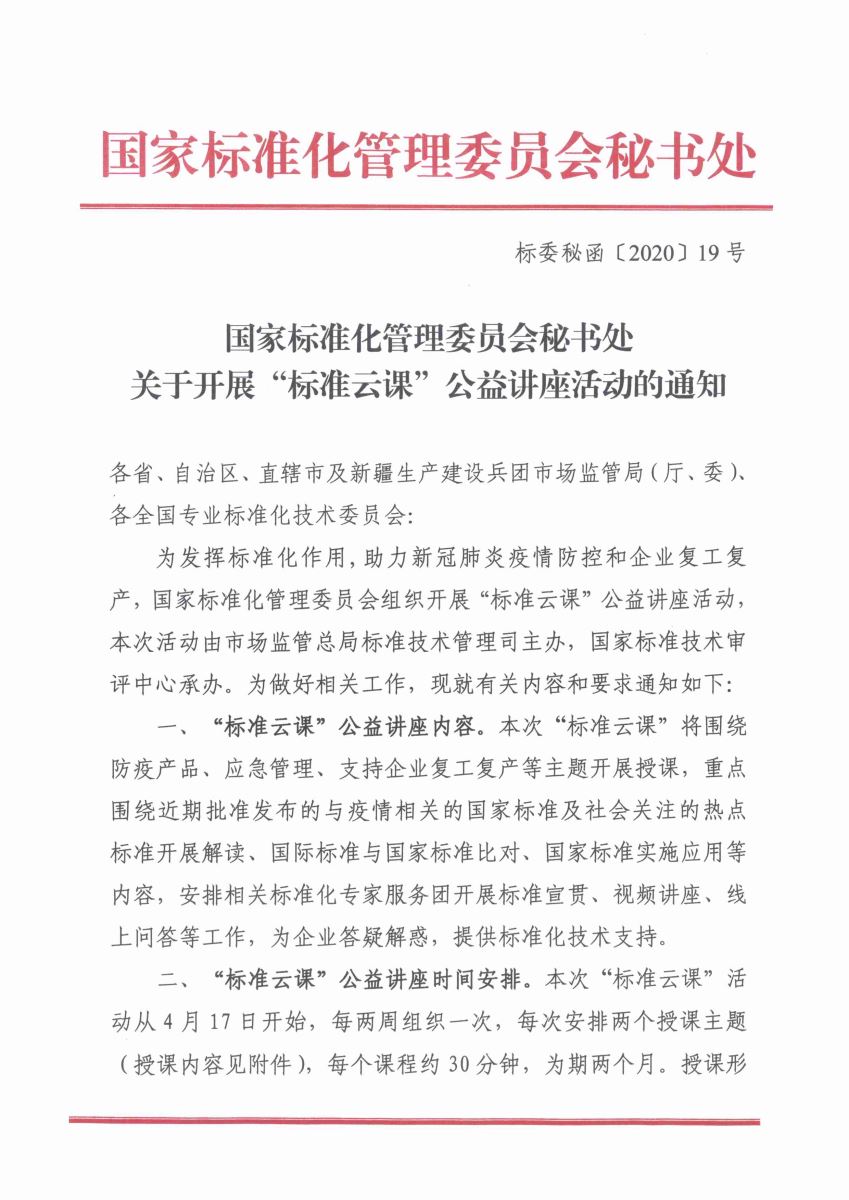 國(guó)家標(biāo)準(zhǔn)化管理委員會(huì)秘書(shū)處關(guān)于開(kāi)展“標(biāo)準(zhǔn)云課”公益講座活動(dòng)的通知