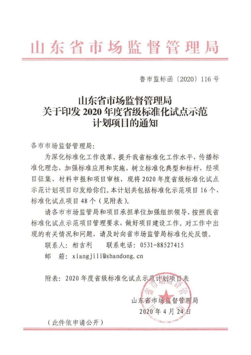 山東省市場監(jiān)督管理局關(guān)于印發(fā)2020年度省級(jí)標(biāo)準(zhǔn)化試點(diǎn)示范計(jì)劃項(xiàng)目的通知
