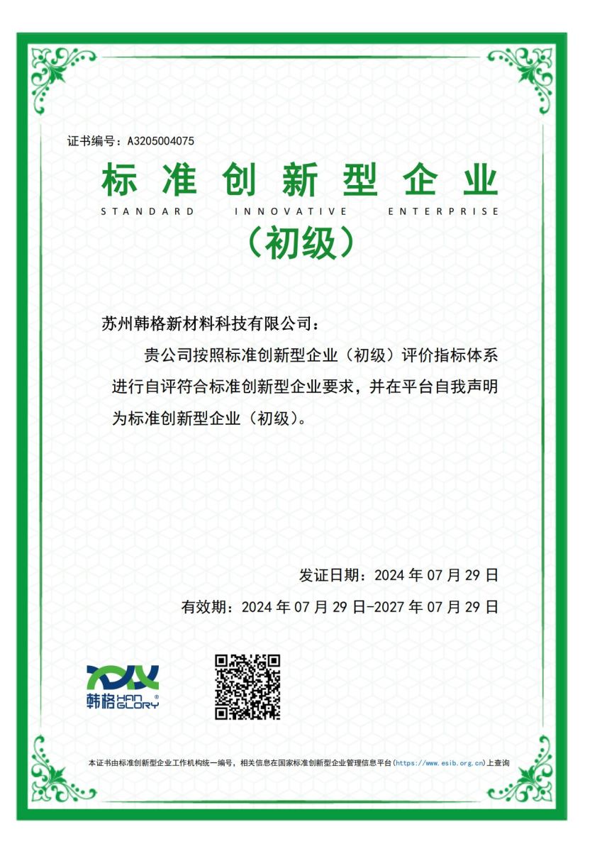 蘇州韓格新材料科技有限公司獲評(píng)標(biāo)準(zhǔn)創(chuàng)新型企業(yè)